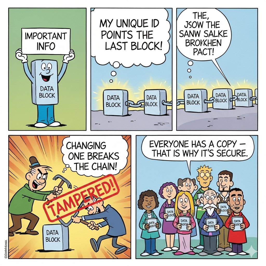 Imagina una cadena de bloques de Lego. Cada bloque contiene información y está conectado al bloque anterior. Si intentas cambiar un bloque en el medio de la cadena, toda la estructura se desestabiliza. Blockchain funciona de manera similar: